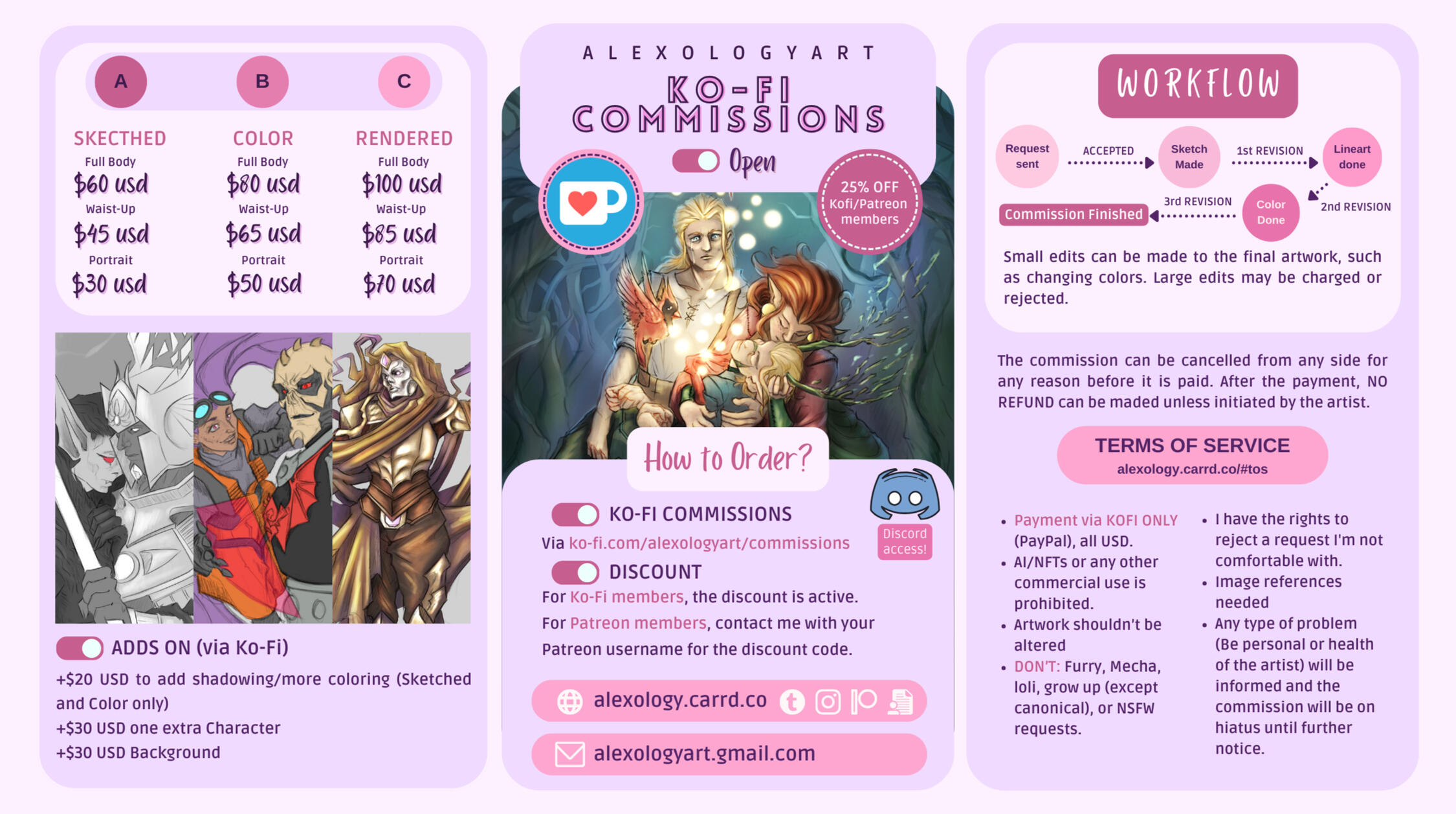 Via PayPal invoice, prices are in USD, Ko-Fi system accepted. No cryptocurrency accepted.